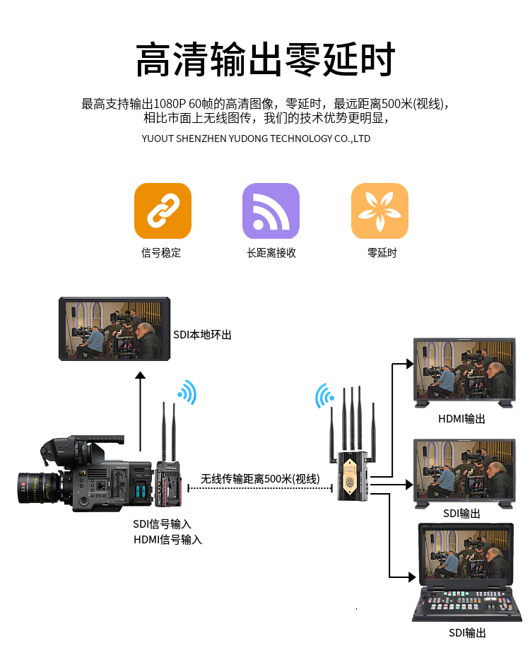 | 傳輸距離/延時 | 空曠距離最遠(yuǎn)可達(dá)約500米 | 無壓縮零延時 |