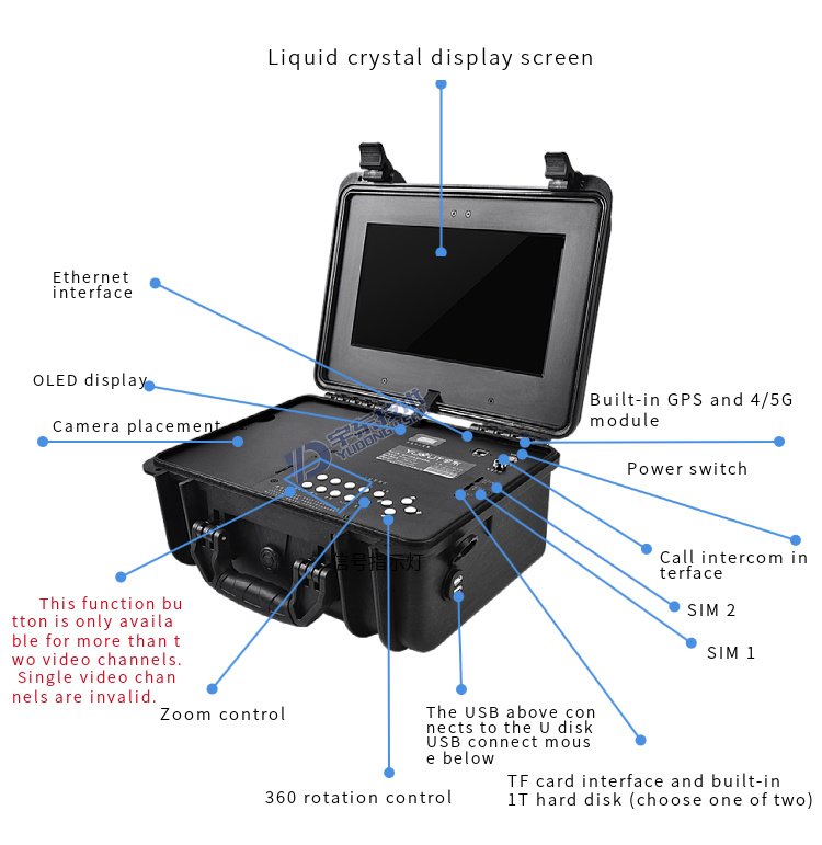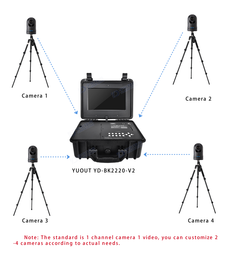 YUOUT YD-BK2220-V2 4G/5G emergency portable command box is developed for military reconnaissance and emergency command equipment. The product can be deployed on mobile carriers such as field war rooms, front-line troop reconnaissance, bunkers, and vehicles, and can collect key information about surrounding personnel characteristics and live video related events. Through YD-BK2220-V2 can display the scene picture in real time, and can carry out 360 rotation and zoom and zoom on the target through the camera, YD-BK2220-V2 supports 4/5G function, can upload the scene video to the headquarters command center in real time, and can also talk to the headquarters. Realize the dispatching, command and emergency handling of the front end headquarters.