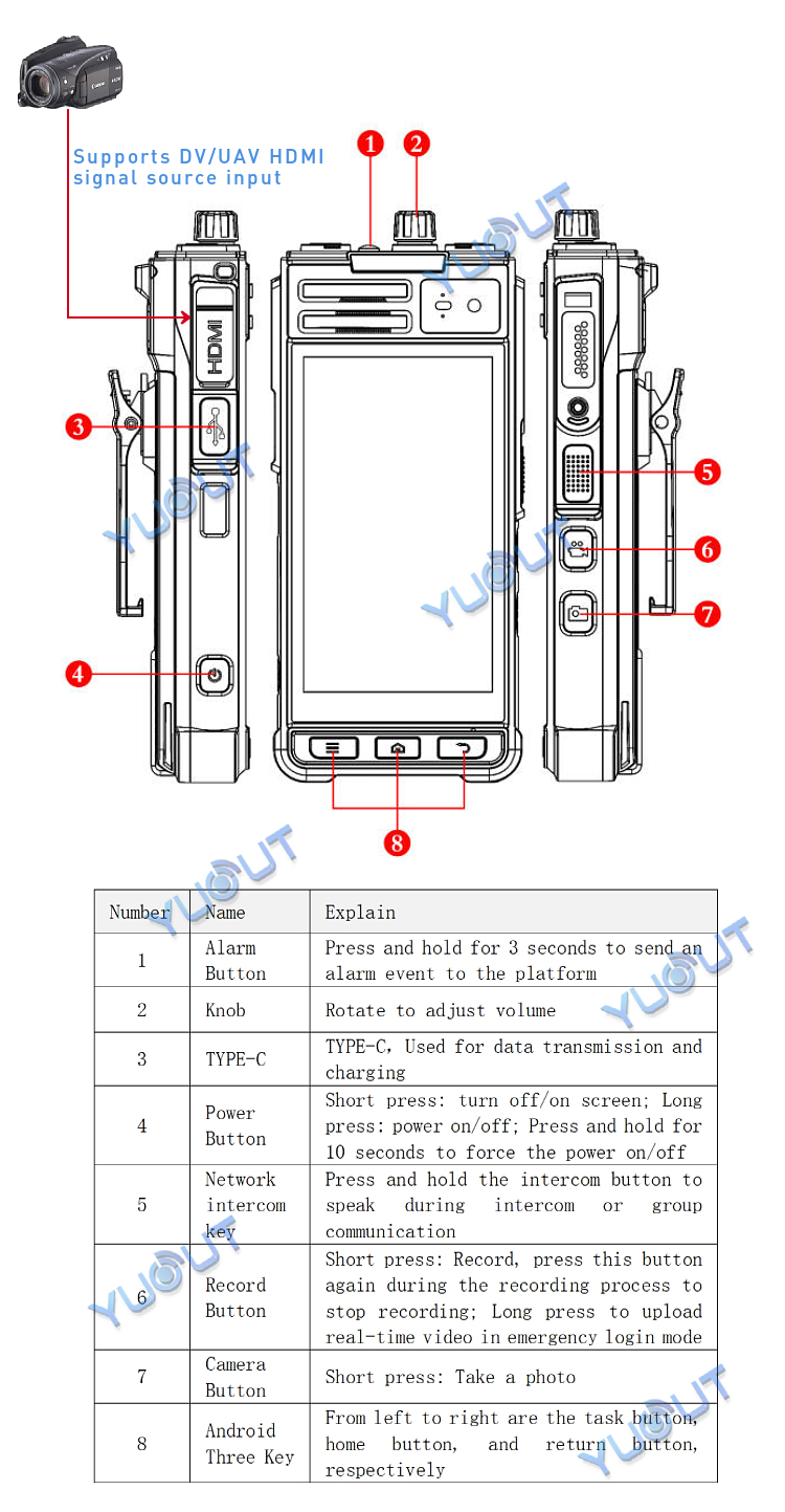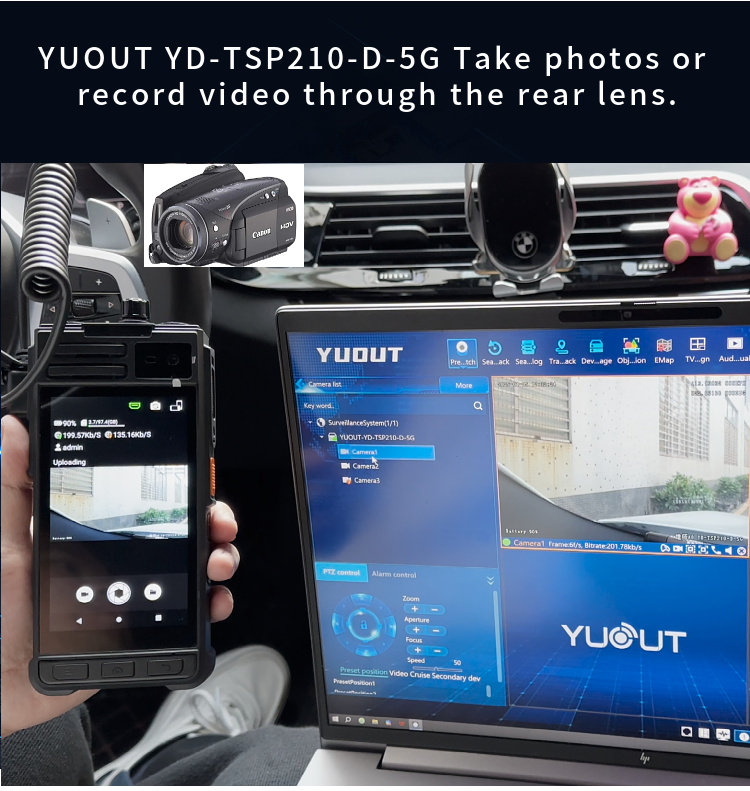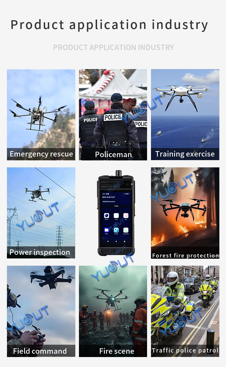 YUOUT YD-TSP210-D-5G is a multi-functional intelligent device with built-in front camera head and rear camera, and supports external HDMI signal source input. This device supports 5G+4G function, and can remotely view the live video of the staff in other regions or cities in the office/command center (for example, I am now in Shenzhen, China, and can view the re-scene video of the staff in Beijing, China), positioning information and call intercom. Install mobile SIM card, can also be used as a mobile phone, can make phone calls. The device is light, easy to carry, and can be hung on the chest and belt. Mainly used in public security patrol, traffic police, drone remote control HDMI output, DV camera and so on.